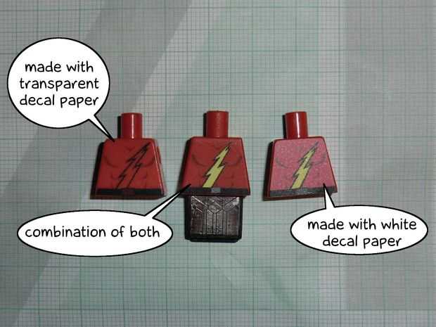 Puedes ver mis resultados en la segunda foto. Solo tengo una impresora laser, como se puede ver, los colores más ligeros desaparecieron cuando estaba usando el papel decal transparente y no pude coincidir con el color del torso cuando estaba usando el papel blanco de la etiqueta. Así que decidí combinar ambos.