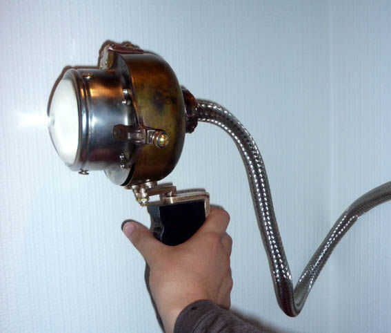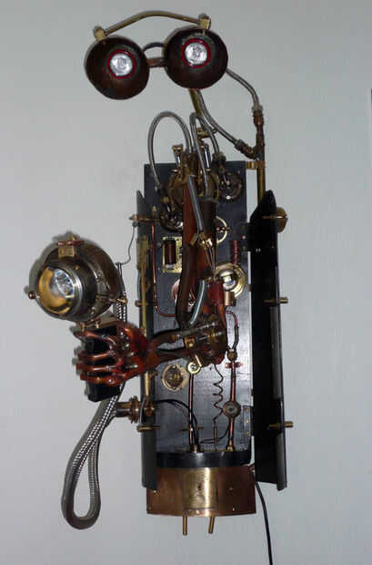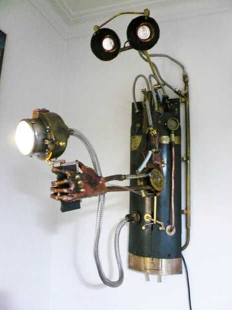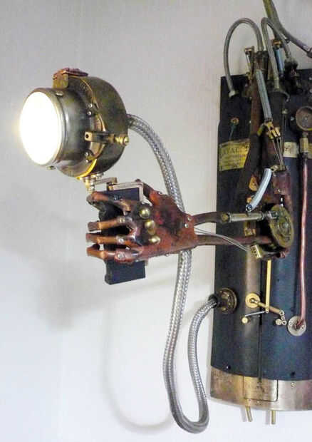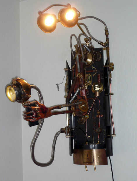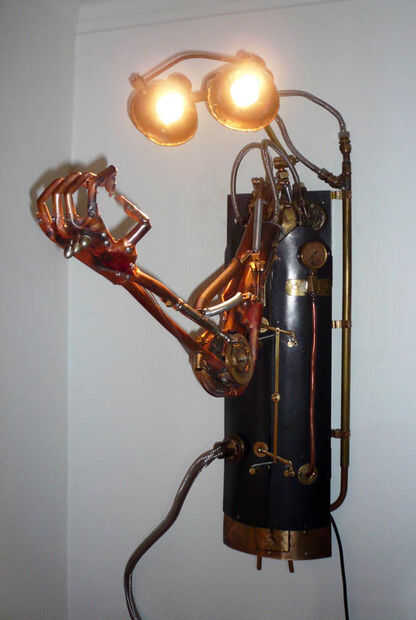 Imaginar muy grandes saurópodos y similares, conducido por un piloto humano residente y aparte de la agilidad natural y armas del animal (garras, garras, masa), también capaz de desplegar todo de cañones de plasma misiles (tiburón pensar armado con un láser). Muy divertido y bastante impresionante para un niño de quince años de edad, pensé. De todos modos, mi proyecto surgió de una necesidad hacer algo que no podría estar fuera de lugar en ese mundo de fantasía, pero que también suscribió un steampunk estético; también, tuvo que ser funcional, por lo que decidí hacer una unidad de iluminación para su cuarto. Actualmente cuelga en su pared y él está muy complacido con el resultado.