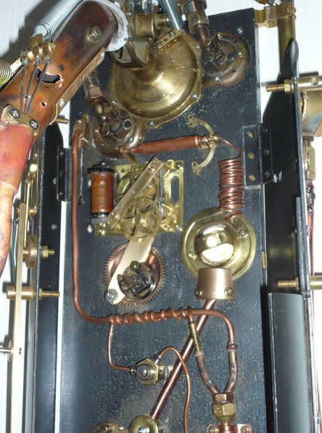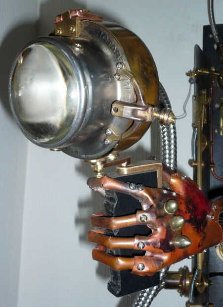 Este proyecto comenzó como un intento de hacer un inspiración steampunk (tal vez más cyber-punk?) mecánica de la mano y el brazo utilizando principalmente el latón y el cobre de chatarra, plantas de reciclaje. A lo largo de la manera que me decidí a hacerla más funcional como una unidad de iluminación y como mi hijo adolescente había escrito un cuento sobre A.T.A.C. (un mundo de ciencia ficción futurista en el que una combinación de ingeniería genética y la tecnología avanzada ha permitido el desarrollo de transporte militar y sistemas de armas que se asemejan a electromecánico, pero altamente armados y peligrosos dinosaurios, en la que el piloto , colocado en una "cabina" en la construcción de pseudo orgánica, controles, por neuro-integración directa, las funciones superiores de la construcción (chico fue al vapor cuando Avatar salió pocos meses después había escrito la historia!).