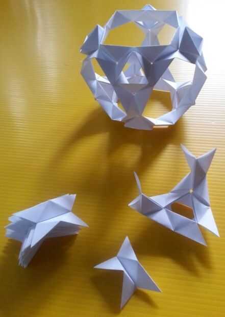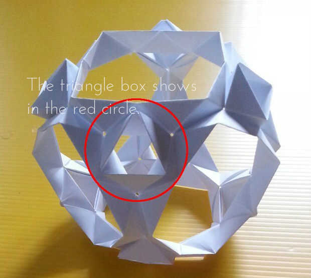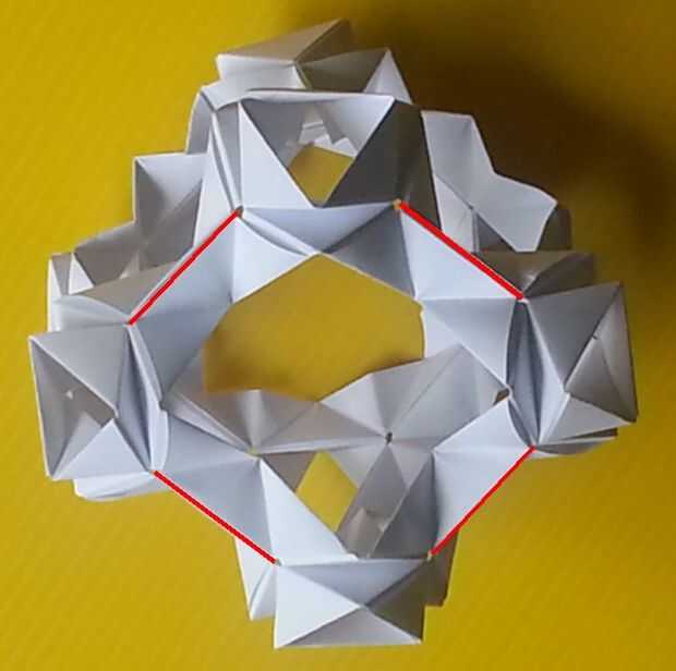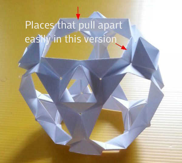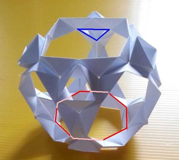 Corté algunos más cuadrados de papel de la impresora. El nuevo modelo es un cubo truncado. Tiene 6 caras octogonales y ocho caras triangulares. Utiliza módulos de 36. Las caras triangulares se asemejan a la caja de triángulo que es la base del módulo. Esbocé una de las caras del Octógono en rojo (y rosa que se oculta detrás de otras partes del modelo). Esbocé una de las caras del triángulo en azul. El problema con este modelo es que tira aparte fácilmente. Por ejemplo, en los lugares con las flechas en la cuarta foto. Tenía dos ideas sobre cómo mantener mejor juntos. pero no quiero crear otra copia del modelo probar ambos. Así que probé un método por un lado, la otra en el otro lado. El quinto cuadro demuestra bloqueo pliegues añadidos. La última foto muestra que invierte algunos de los módulos. Las líneas rojas muestran los segmentos del Octógono que enfrentaban en el modelo de ahora están mirando hacia fuera. Extrañamente esto funciona sobre así como los pliegues en el bloqueo. Hay más, aquí,