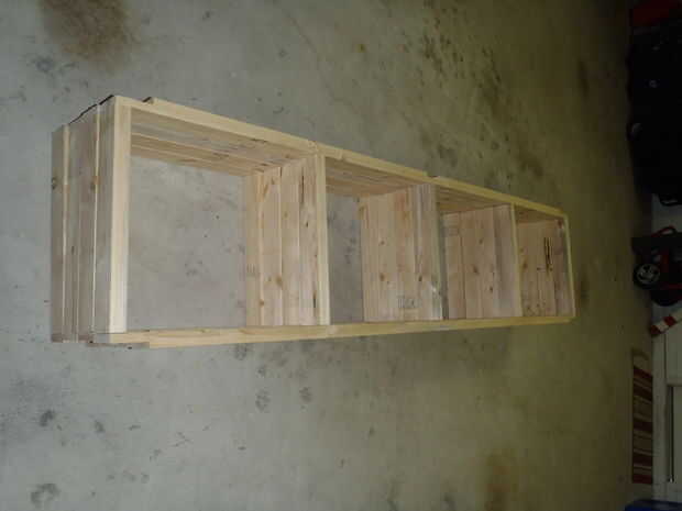 Descripción:Estantes a lo largo del garaje para 3 coches.  Construido en dos secciones... alto y corto que encajan perfectamente entre sí.  Sección corta permite la separación de puerta de garaje.Nota: Los estantes se muestran con las piezas MDF sin