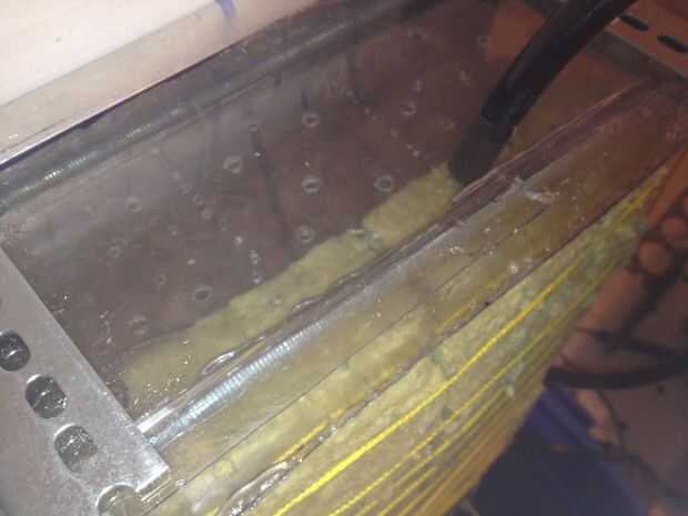 En la parte superior del sistema creó una cámara sellada mediante la adición de una pieza delantera y la parte inferior de plexiglás con el silicio que era aproximadamente una pulgada y una altura media que llena un cuarto de esa manera para arriba con agua cuando el agua de prueba.