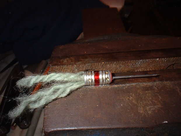 A continuación, tome el pin, y colocar los pedazos de lana en él, sólo fuerza el pasador a través de los hilos y se llevará a cabo, confía en mí.