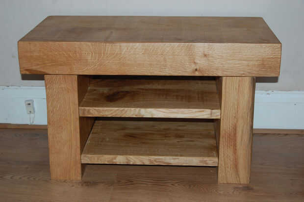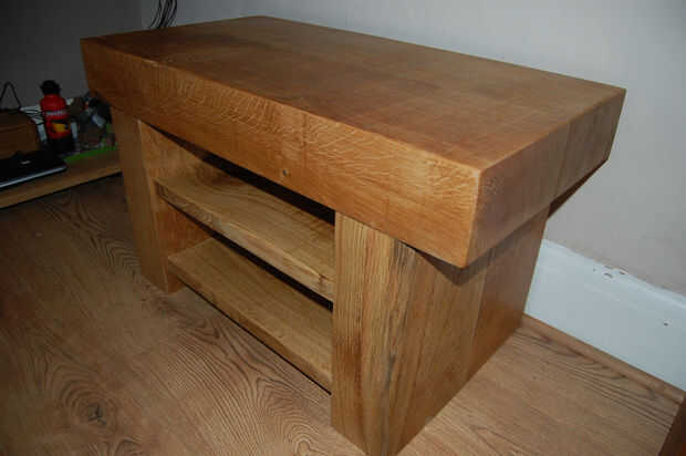 Mi primo se puso en contacto con mí para preguntar si podía hacer le un televisor como estaba a punto de comprar uno fuera de ebay. Me envió un enlace al que quería y parecía bastante fácil de hacer así que siguió adelante y hecho. Éste está hecho de durmientes de roble sólidos nueva y un tablero roble que conseguí desde el mismo lugar. Es muy pesado por lo que he hecho a desarmarse fácilmente para transportarlo y así se puede mover más fácil en el futuro si alguna vez quiere moverlo.