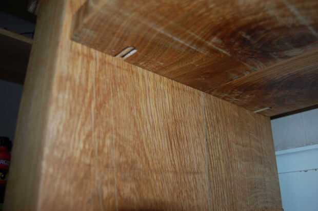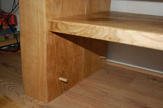 Para fijar los estantes a la unidad quería las fijaciones deben ocultarse así que decidí perforar y colocar algunas espigas de madera en el interior de las piernas y enrutados algunas ranuras correspondientes en la parte inferior de los estantes. Estos pueden simplemente ser lugares principales en los tacos y fácilmente eliminado cuando sea necesario.