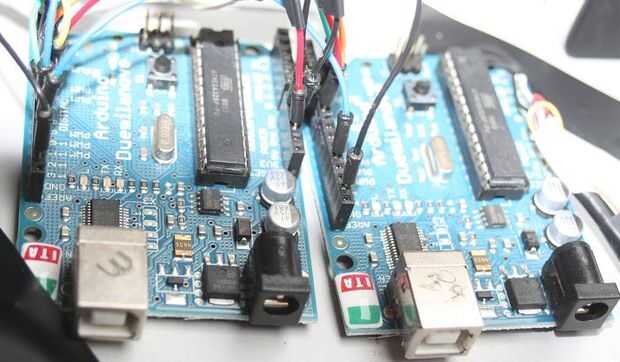Arduino 1 aquí se muestra a la derecha con los cables del nunchuck que vienen en él. Se muestran los cables del enlace de 1 Arduino Arduino 2 y 2 de Arduino está a la izquierda.
