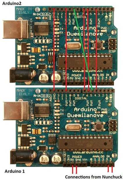 Conectar clavijas Digital de Arduino 1 con pernos digitales de Arduino 2 como sigue: