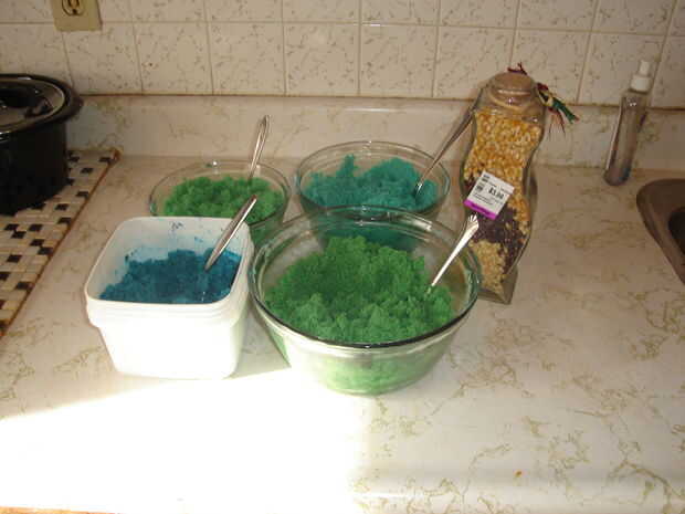 Puse la comida azul y verde colorido... los colores de mi boda. Hice una petición que así-y-de ser más verde así que por lo que-y de ser más azul, pero aparte de eso, dejo el reinado de creatividad! Agregaron algunos colorante azul del alimento y luego un poco de verde, amarillo estaba disponible y el propio color arena.