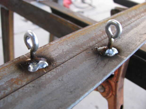 3. utilizando un pequeño imán de soldadura, coloque el tornillo de ojo en la marca, el centro y alinéelo y tachuela soldarlo en su lugar. Repita esto para las otras tres monturas de ojos tornillo/cadena.