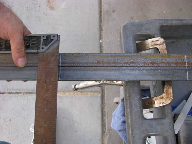 1. corte dos trozos de ángulo de hierro 18-1/2" de largo. Fije las dos piezas juntas. Usando un cuadrado, haga una marca de 1-1/4" de un extremo y un segundo 9" de la primera. Esto proporcionará espacio para las luces.