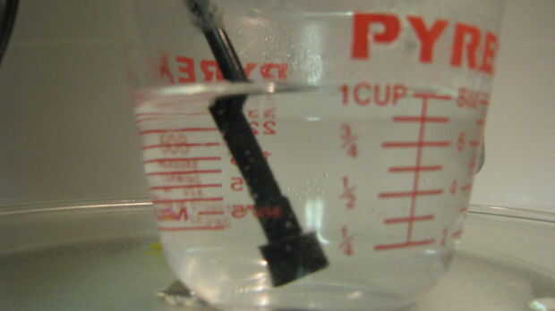 12. calentar una pequeña cantidad de agua en un recipiente adecuado para microondas en el microondas, apague el horno de microondas y sumerja el extremo de la línea de polietileno en agua caliente.