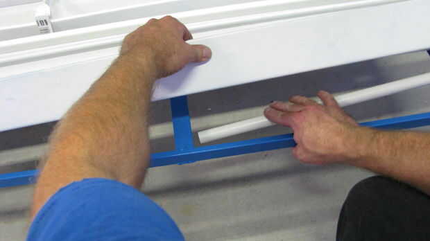 16. al colocar el canal en el marco, puede ser necesario doblar el tubo de desagüe hacia abajo beneathe los travesaños.
