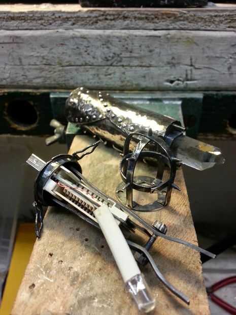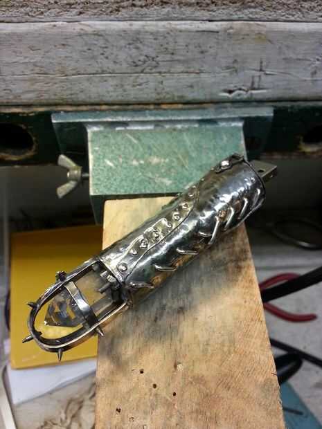 Los tres elementos de plata: shell, jaula de cristal y placa USB se oscureció y luego pulidos para destacar la textura como remaches y puntadas.