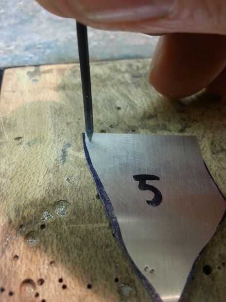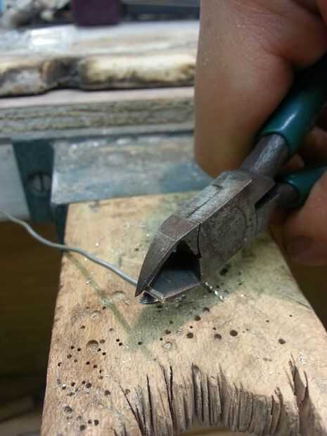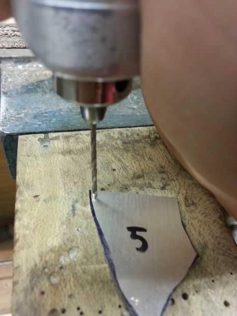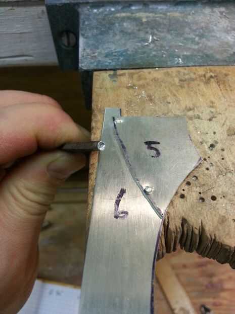 Después se cortaron las piezas, me perforó agujeros en las esquinas y había clavado junto con la ayuda de la herramienta de creación propia. Los remaches sólo están hechos de alambre de plata cortado. Después se conectaron las esquinas de las placas, los remaches restantes fueron instalados a lo largo de los dos bordes milímetros apartes.