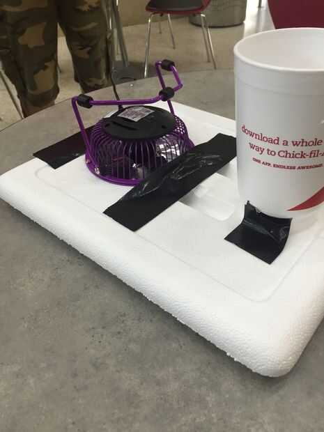 Utilice cinta adhesiva para asegurar el ventilador y taza de espuma de poliestireno a la tapa de la nevera en los contornos correspondientes.