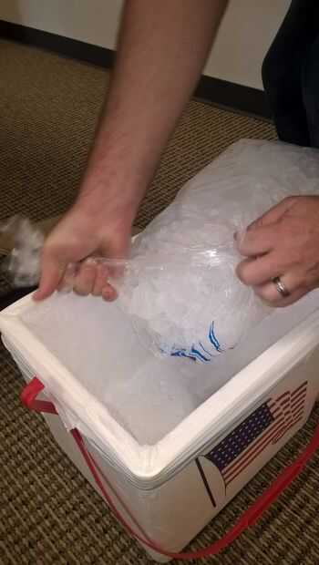 Llenar la bolsa de basura en la nevera con hielo hasta que el refrigerador se llena hasta la mitad.
