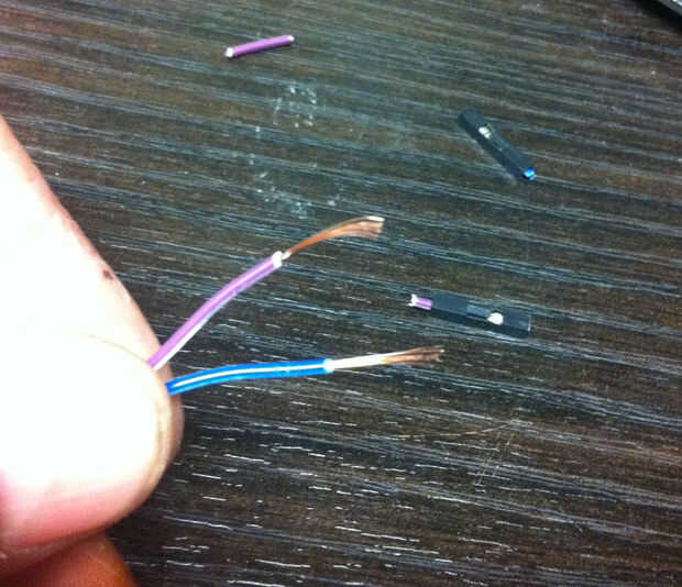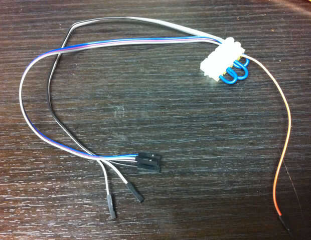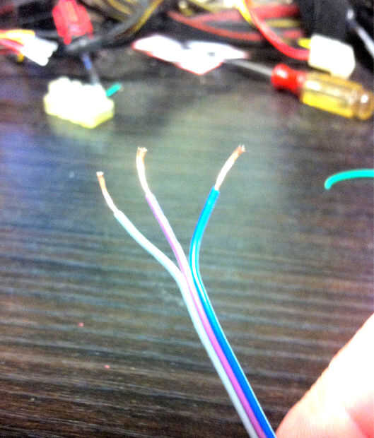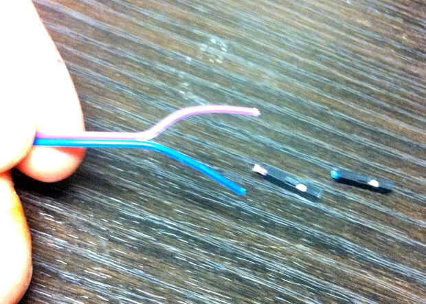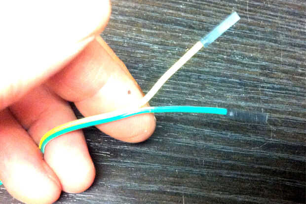 el siguiente conjunto de alambres que debemos hacer es el que funcionará el motor paso a paso y la luz en la parte delantera. tira 2 cables juntos fuera de la cinta y cortar los pugs de un extremo, el aislamiento y tuerza. Ahora necesita un cable corto con 1 enchufe en el extremo, me la pelaron un solo cable de la cinta y cortar directamente por la mitad, esto me lo suficientemente dio para 2 juegos de cables. Tira el cable individual y giro al doble conjunto de alambre y utilizar grifo de aislamiento para asegurarlo todo en lugar y evitar cortocircuitos. se necesita hacer este cable de 2 a 1 set para cada unidad de disquete que desea utilizar.