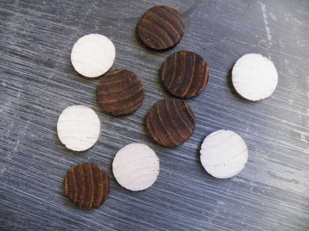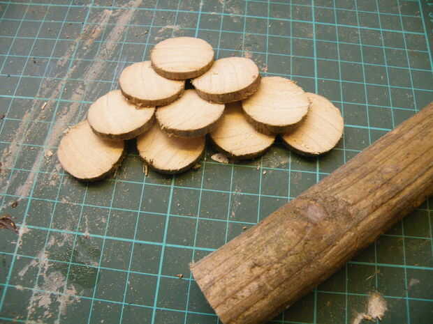 Esto resultó para ser ridículamente difíciles, y en lugar de ello cambié a sugerencia de Kitewife de usar rebanadas de un mango de escoba de madera vieja. Para mantener las rebanadas incluso, me lió la escoba a través de la Sierra de calar.