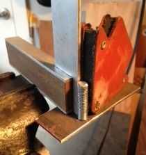 Soldar con autógena el perno a la placa base. (Soldadura suele provocar cierta distorsión. Puse el borde de la placa base en un tornillo de banco y utiliza un martillo golpeando contra una tuerca en la varilla roscada para devolver la varilla roscada en su posición antes de la soldadura. Una alternativa hubiera sido aprovechar los hilos de rosca de la placa base. Girar el vástago roscado en la placa base por lo que su extremo quede al ras con la superficie inferior. Agregue una tuerca en la parte superior).