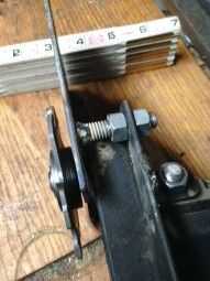 La longitud de las varillas roscadas montado en la placa base puede determinarse colocando el disco de corte del molino y posicionamiento de la placa base para la madera más delgada que de unirse con el unidor de galletas. En mi caso, decidí madera de 1/2" es el más fino que se necesita. Medir hasta la pieza de marco y tener el espesor de una tuerca. En el caso de mi amoladora de ángulo,