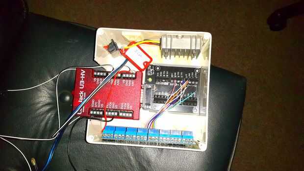 El sistema nervioso de mi configuración de automatización es el Labjack u3 hv. Lo puse en un cuadrado de 7 pulgadas caja del PVC con una tarjeta de relé de 8 más un convertidor de CC de 5 voltios. Todos estos que se pegan al PVC con adhesivo de silicona negro.