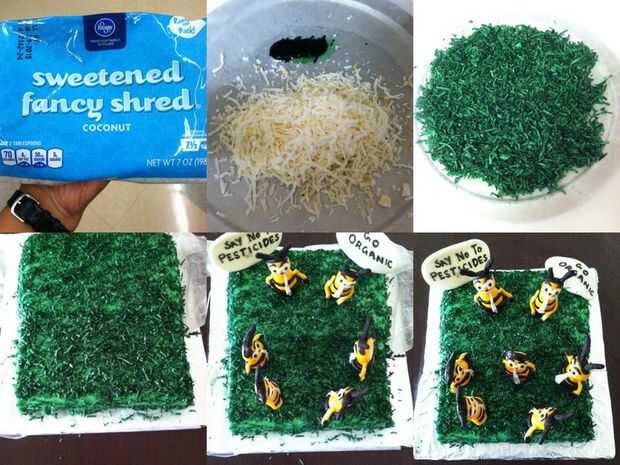 • Quería darle un acabado de la hierba, por lo tanto tomó coco rallado endulzado y agregó color verde 1/2 cucharadita