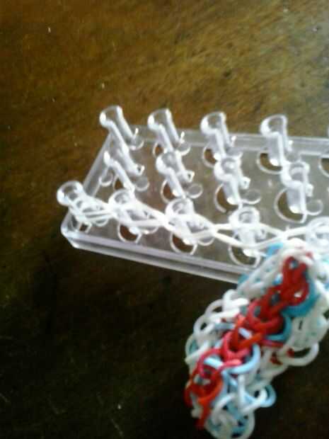 esto es un braclet muy fácil y divertido para hacer. Esperamos que disfrutes!Paso 1: materiales Se necesita: un telar, gancho, elásticos y un clip de C.Paso 2: Colocar los elásticos Primero escoger tres colores y a la clavija central. Sacó su color e