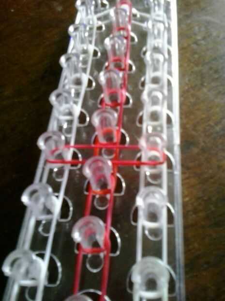 esta es probablemente una de las pulseras más fáciles se puede hacer! Les espero guste!Paso 1: Lo que necesitará 1. un telar2. un gancho3. colores bandasPaso 2: Vamos a empezar! Añadir sólo una cadena de bandas en el centro del telar. Puede utilizar