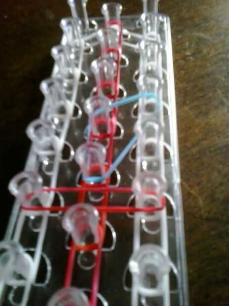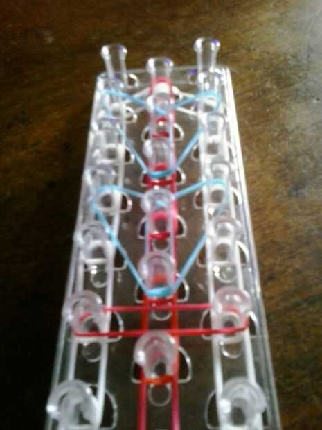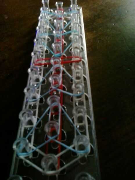 esto es un braclet muy fácil y divertido para hacer. Esperamos que disfrutes!Paso 1: materiales Se necesita: un telar, gancho, elásticos y un clip de C.Paso 2: Colocar los elásticos Primero escoger tres colores y a la clavija central. Sacó su color e