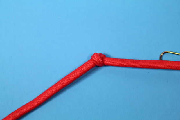 Mi cuerda fue demasiada larga, así la acorté por deslizar un gancho hacia el otro, até un nudo al extremo nuevo y recorté la cuerda extra.