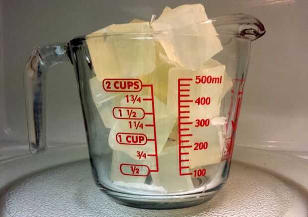 Si se utiliza microondas, derretir jabón en incrementos de 40 segundos. Sólo tarda generalmente 2 a 3 rondas a derretirse todo el jabón. Si usando método de la estufa, colocar taza tarro de masón/pyrex en agua en una cacerola.