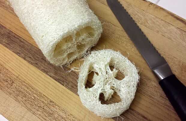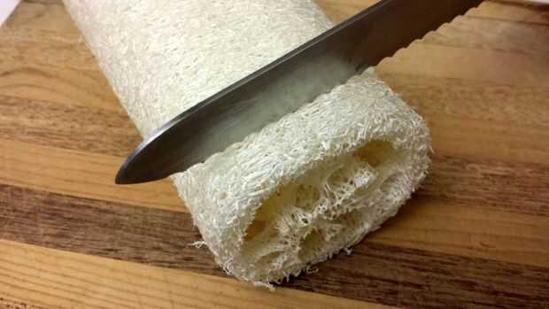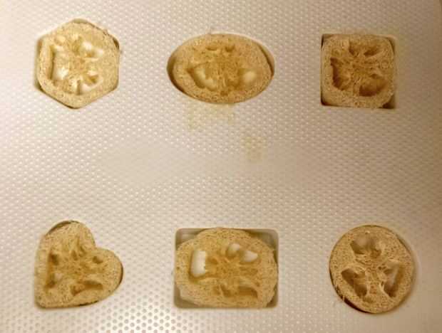 Preparar loofa por corte con cuchillo de sierra. Me gusta hacer mis rodajas de la misma altura que mis moldes. Esto mantiene la loofa expuesto, por lo que sus cualidades de limpieza están disponibles desde el principio. Coloque rebanadas de loofa en moldes.