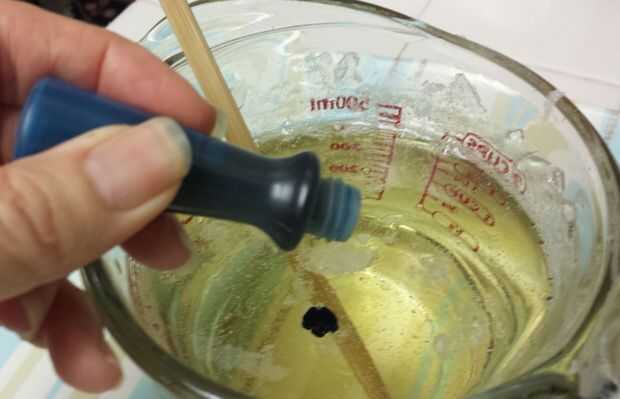 Mezclar colores y aceites esenciales bien en jabón derretido.