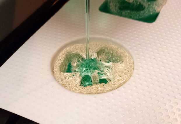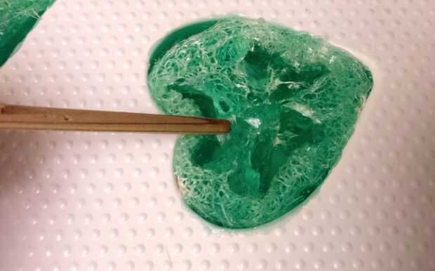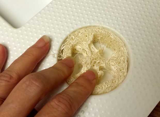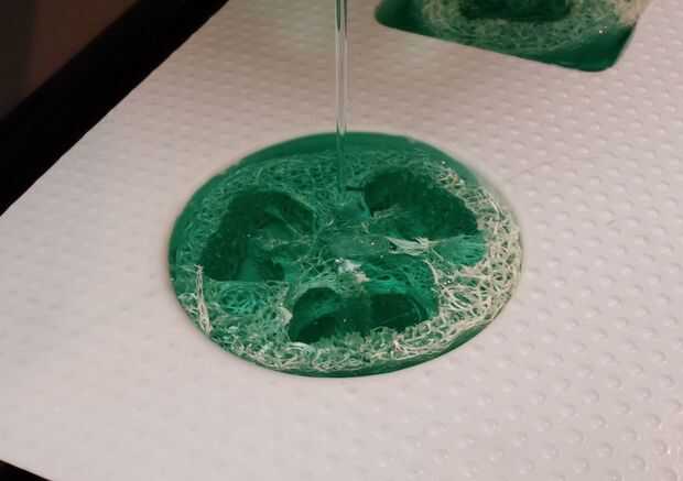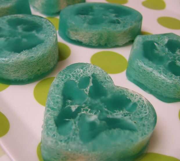 Vierta el jabón en los moldes preparados, presionando hacia abajo el loofa para asegurar la saturación completa.