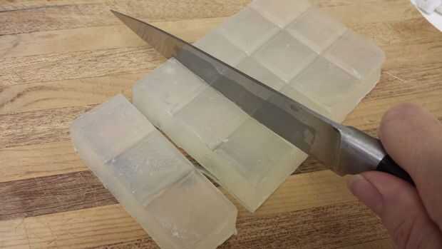 Cada molde del jabón tiene 3 a 4 onzas de jabón y jabones más fusibles vienen anotadas en secciones de 1 onza. Cortar el jabón base en cuadrados y colocar en la taza medidora resistente al calor.