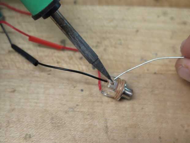 El 1/8" conector de sonido que tienes es un ingenioso dispositivo. El rojo (+) de la soldadura a la ficha conectada al grifo del centro (la parte metálica que sobresale de la parte inferior que el enchufe haga clic bien en con. El negro a tierra (-) que se conecta a la caja de metal de la soldadura.