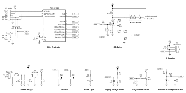 Controlador principal (PIC16F1823) toma las entradas del circuito del conductor y control Q1 para lograr la salida deseada. Elegir PIC16F1823 como el controlador para este proyecto. Los puntos clave para elegir este PIC están que ha construido en comparadores analógicos, y corre a 32MHz sin necesidad de un cristal.