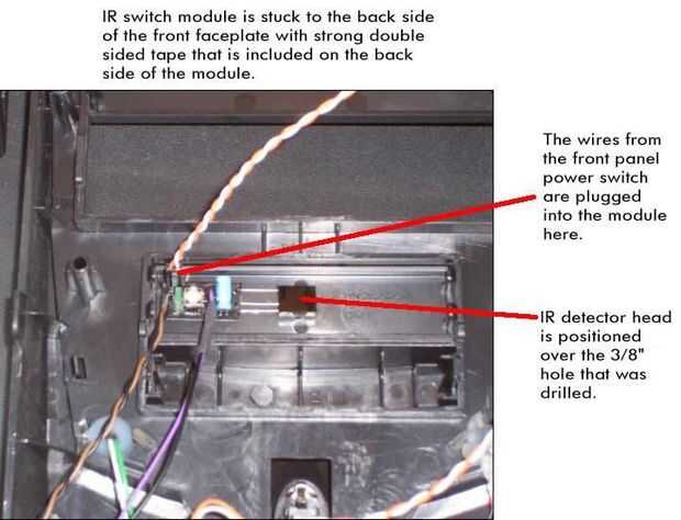 En este punto, también conectar el interruptor del panel frontal del módulo de interruptor IR. Esto me permite controlar la potencia de la PC ya sea manualmente o con el mando a distancia IR.