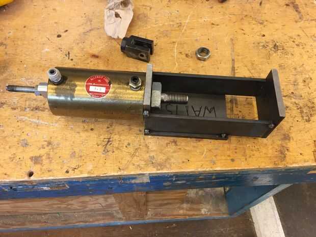 Inserte el collar de cilindro neumático a través del orificio pretaladrado. Instale la tuerca para sujetar el cilindro en su lugar.