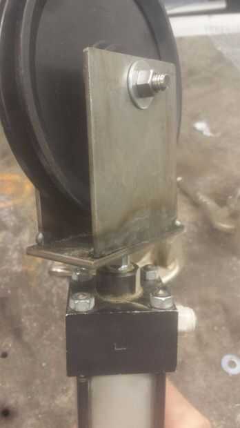 Probablemente también necesitamos crear un montaje en 90 grados como estamos montaje esta al lado del marco. Creé dos piezas idénticas de acción plana y los soldados con autógena juntos. entonces había soldado a una placa como visto morada y lija la ficha hasta que el pasador se ajusta perfectamente a través de los orificios. También queremos poner lavadora tantos como sea posible en ese pin, queremos eliminar la ondulación en el pasador.