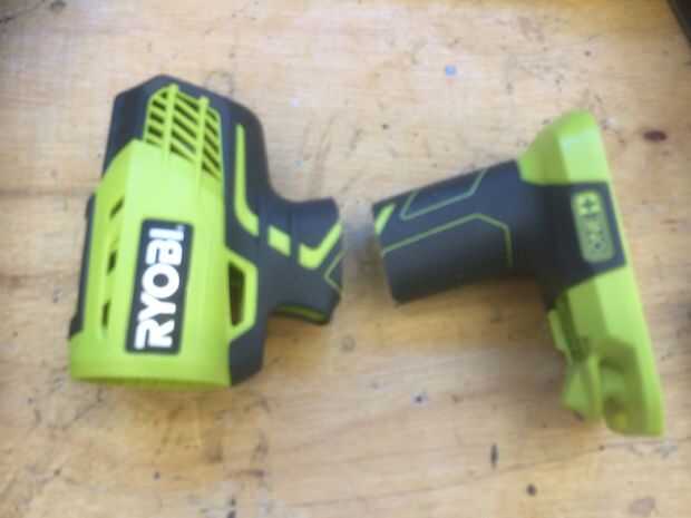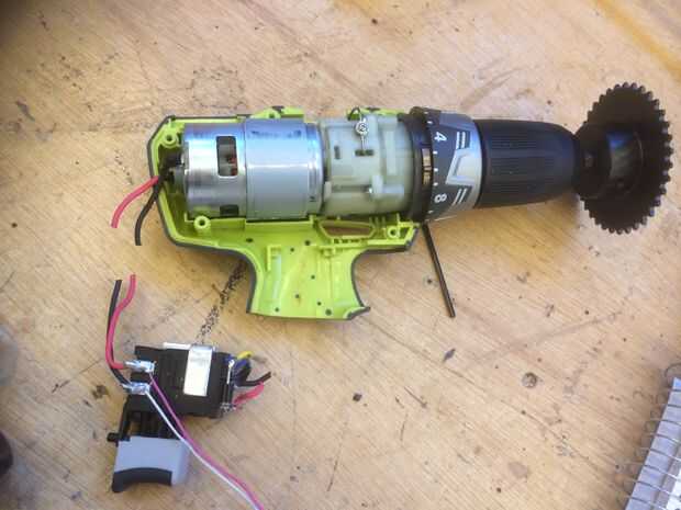 Usted debe terminar con la mitad superior del taladro que contiene el cuadro motor y engranajes y la mitad inferior del taladro con los clips de batería y montaje plástico. Ambas piezas deben tener un negro y un hilo rojo 5'.