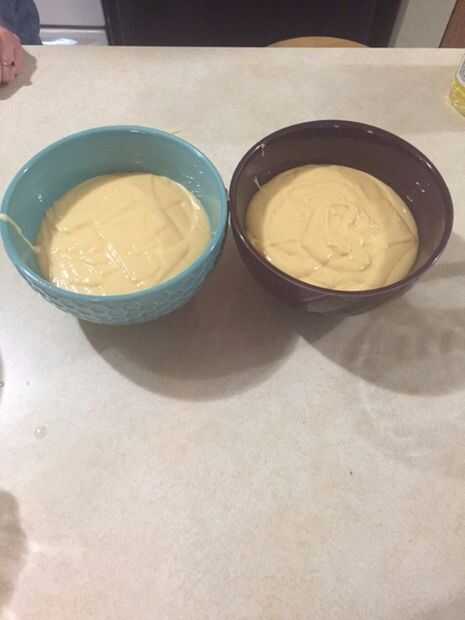 Vierta la mezcla del pastel en los dos tazones de fuente más pequeño con aproximadamente la mitad de la mezcla en cada uno. Si desea un color más dominan, agregar más masa a uno de los tazones de fuente. Seleccionar los colores de tinte de comida de su elección. Para los colores de la Universidad Estatal de Illinois, use los colorantes rojos y amarillos. A pesar de la mezcla de la torta es amarillo, el budín es probable que cambiar el color de la torta, así el tinte amarillo es necesario. También puede elegir cualquier variación de los colores para un pastel de un tema diferente.