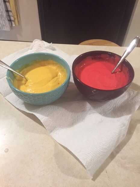 En uno de los tazones de fuente de mezcla de pastel, agregue aproximadamente 60 gotas de colorante alimentario rojo. Tenga cuidado de agregar las gotas de colorante como puede cambiar el color de cualquier superficie están preparando la torta de. Poner papel de cocina debajo de los tazones de fuente durante este paso puede prevenir esto. No añadir suficiente resultan en un color rosa, así que ser generosos. Mezclar bien hasta que el colorante se ha extendido a lo largo de la masa y completamente rojo. En el segundo recipiente, añadir de 2 gotas de colorante de alimento amarillo. Revuelva hasta que la torta esté sólidamente amarilla. Si no usa mezcla para pastel amarillo, tienes que añadir más para que cuando revuelve la masa parece ser sólida amarillo. Añadir más colorante fortalecerá su color, si el pastel no es el color que desee mantener agregando unas pocas gotas a la vez.