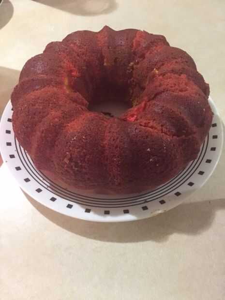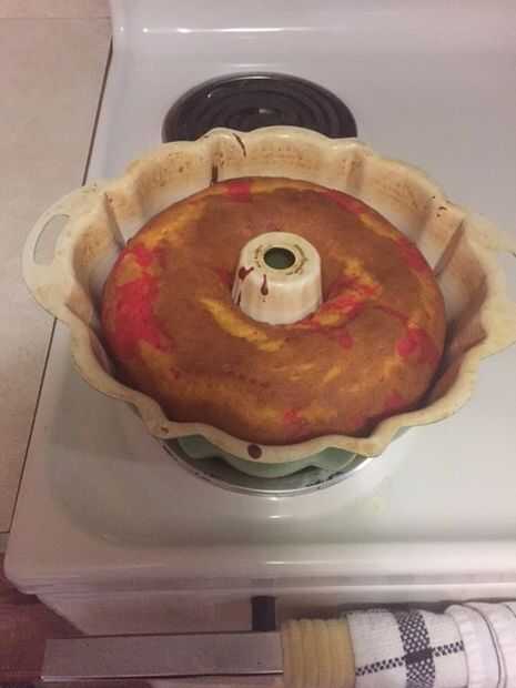 Sacar el pastel del horno y dejar enfriar durante 10 a 15 minutos antes de retirarlo de la sartén. Una vez que la torta se siente fría, coloque un plato grande y plano boca abajo sobre la parte superior de la cacerola de bundt y darle la vuelta todos boca abajo, para que la placa es hacia el lado derecho hacia arriba y en la parte inferior. La torta debe salir suavemente sobre la placa. Si el pastel no parece como que esta por salir, puede que necesite aflojar los bordes con un cuchillo de la mantequilla con cuidado y use aerosol de cocina más la próxima vez.