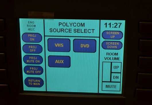 El Polycom fuente seleccione selección controla el uso de las conexiones VHS, DVD y Aux.  Según el panel de control, estas opciones pueden encontrarse también en la pantalla principal.  Se recomienda utilizar los botones en la pantalla principal.