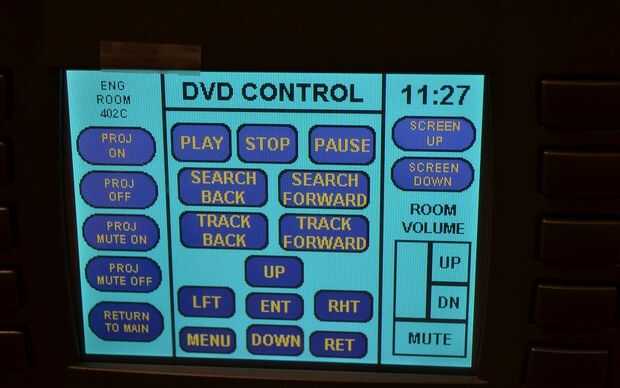Algunas aulas tenga un reproductor de DVD incorporado en el escritorio que se puede utilizar para jugar de DVD.  Sin embargo, como también tienen un equipo con un jugador de DVD construido en, se recomienda para utilizar la computadora en el reproductor de DVD.