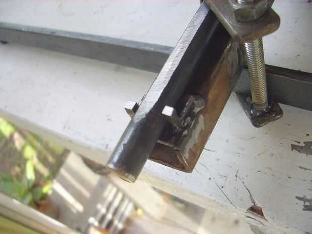 Ahora la plancha fue limitado por un extremo, pero el otro era flojo. Pensé una arandela en el extremo del brazo horizontal de la autógena, pero luego me di cuenta que hacen muy difícil quitar de su lugar, ya que la lavadora se impediría pasando por debajo de las pinzas, a menos que totalmente se aflojaron. Así que decidí soldar dos topes laterales para mantenerlo en su lugar.