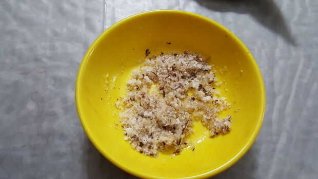 Calentar el Ghee en una sartén y agregar las castañas de cajú, pasas de uva y coco rallado en él. Añadir azúcar en eso y mezclar bien hasta marrón claro coco convertido en.