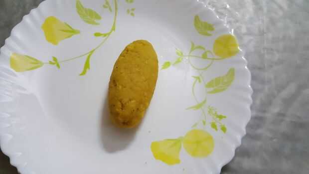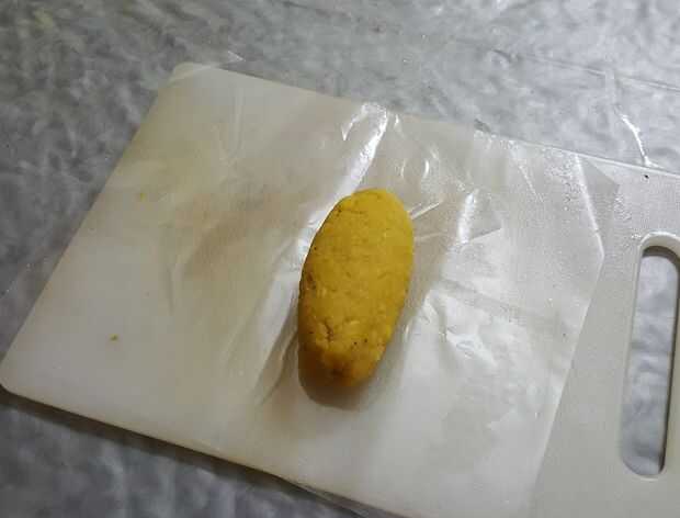 Cierre y enrolle en forma larga ovalada. Bloquear los lados abiertos de la mezcla de plátano aplastado y darles forma como ves en la imagen. Repita el proceso con el plátano restante.
