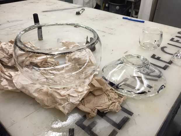 Una vez que tuve mis dos hermosas burbujas, el siguiente paso fue cortar en una aproximación áspera de su forma de tazón de fuente. Para ello, utilicé una sierra circular de diamante sinterizado – tipo de como una carpintería tronzadora excepto que constantemente ha inundado con agua y elimina material por abrasión en lugar de cortar virutas de la forma de que una lámina de madera o metal puede. Todo en una tienda de grisallas de cristal se sumerge en agua, para evitar que el vidrio calentando y el agrietamiento y para mantener el polvo de vidrio y fragmentos de contenidos y hacia fuera del aire. La Sierra de diamante deja un borde super fuerte, super irregular, splintery super, super antipático.